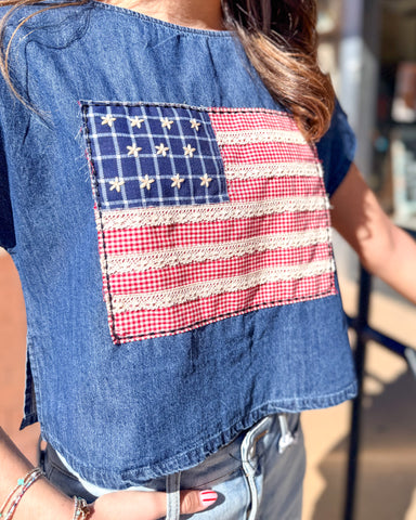 Indigo Patchwork Flag Crop Top – Patriotic denim graphic with vintage vibes This denim crop top is giving all the All-American energy Crafted from...