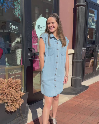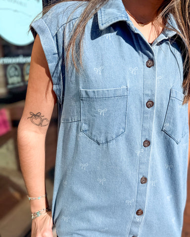 Elevate your casual wardrobe with this ultra-soft, 100% cotton washed denim shirt dress featuring a charming, trendy bow print. Its sleeveless, but...