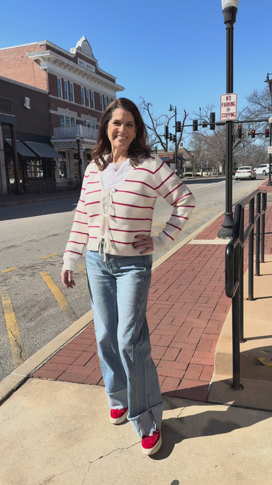 Ivory & Red Tie-Front Cardigan – Striped lightweight knit with feminine detail This striped tie-front cardigan is such a fun twist on a classic...