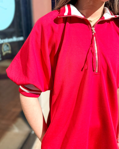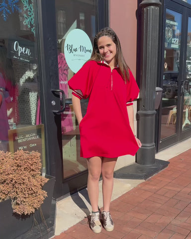 Game Day Zip Polo Dress – Red athleisure mini with sporty stripes This red polo dress is the ultimate mix of sporty and chic. Featuring a zip-up ne...