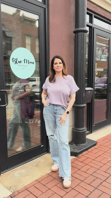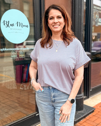 Blush & Blue Stripe Jersey Top – Soft striped knit tee with relaxed everyday style This pink and blue striped jersey knit top is the definition...