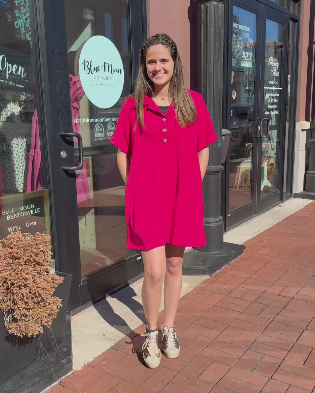 This bright shift dress is the definition of effortless chic. With its relaxed silhouette, collared neckline, and statement button-front detail, it gives you that classic, put-together look with zero fuss. The vibrant scarlet hue makes it perfect for game days, holiday events, or any moment you want to stand out in style.
