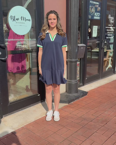 Navy Polo Dress w/Green & White Stripes