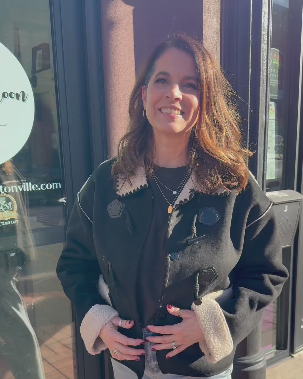 Meet your new cold-weather staple. This black faux suede shearling jacket delivers that classic look with a cozy twist. The soft interior lining, cuff details, and toggle closures make it a standout piece that’s both warm and chic. Perfect for layering on chilly Bentonville days (and looking good doing it).