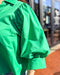 This kelly green polished poplin top brings bold color and effortless polish to your wardrobe. The structured fabric gives it that put-together look, while the relaxed shape and statement sleeves keep it comfortable and wearable. It’s one of those tops that instantly makes jeans look intentional.