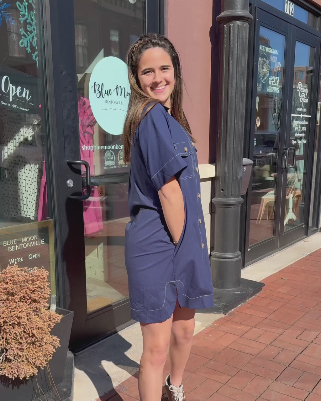 This navy shirt dress is the definition of effortless style. Designed with bold contrast stitching, oversized front pockets, and a relaxed button-front silhouette, it’s the perfect blend of polished and casual. Lightweight rayon-linen fabric keeps it breathable, while the structured details give it that modern, tailored edge we love for everyday wear in Bentonville and beyond.